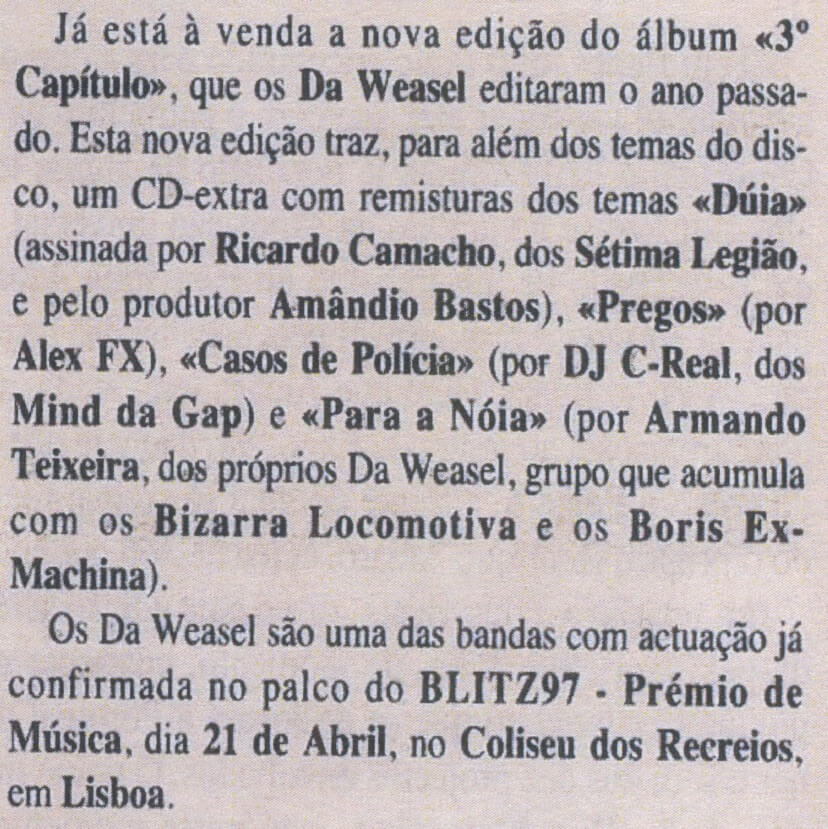 Os Da Weasel são uma das bandas com actuação já confirmada no palco do BLITZ97 – Prémio de Música, dia 21 de Abril, no Coliseu dos Recreios, em Lisboa.