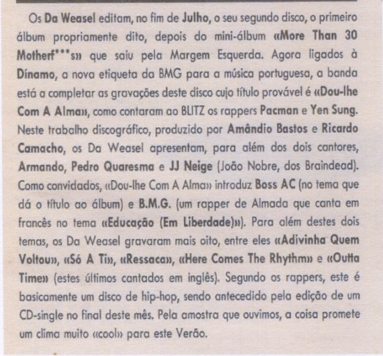 Agora ligados à Dínamo, a nova etiqueta da BMG para a músico portuguesa, a banda está a completar as gravações deste disco cujo título provável é «Dou-lhe Com A Alma», como contaram ao BLITZ os rappers Pacman e Yen Sung.