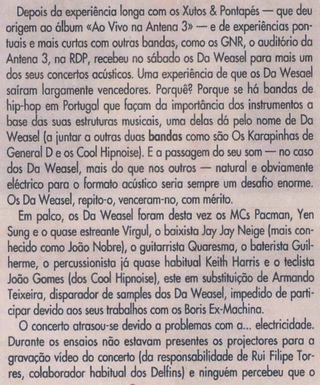 Uma experiência de que os Da Weasel saíram largamente vencedores. Porquê? Porque se há bandas de hip-hop em Portugal que façam da importância dos instrumentos a base das suas estruturas musicais, uma delas dá pelo nome de Da Weasel (a juntar a outras duas bandas como são Os Karapinhas de General D e os Cool Hipnoise). E a passagem do seu som – no caso dos Da Weasel, mais do que nos outros – natural e obviamente eléctrico para o formato acústico seria sempre um desafio enorme. Os Da Weasel, repito-o, venceram-no, com mérito.