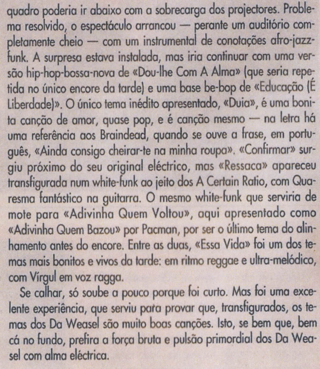Se calhar, só soube a pouco porque foi curto. Mas foi uma excelente experiência, que serviu para provar que, transfigurados, os temas dos Da Weasel são muito boas canções. Isto, se bem que, bem cá no fundo, prefira a força bruta e pulsão primordial dos Da Weasel com alma eléctrica.