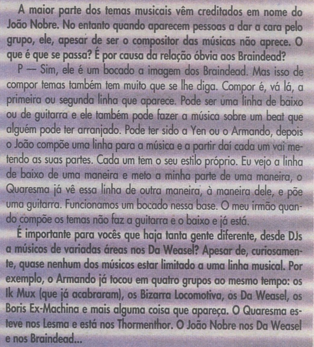 P — Sim, ele é um bocado a imagem dos Braindead. Mas isso de compor temas também tem muito que se lhe diga. Compor é, vá lá, a primeira ou segunda linha que aparece. Pode ser uma linha de baixo ou de guitarra e ele também pode fazer a música sobre um beat que alguém pode ter arranjado. Pode ter sido a Yen ou o Armando, depois o João compõe uma linha para a música e a partir daí cada um vai me-tendo as suas partes. Cada um tem o seu estilo próprio. Eu vejo a linha de baixo de uma maneira e meto a minha parte de uma maneira, o Quaresma já vê essa linha de outra maneira, à maneira dele, e põe uma guitarra. Funcionamos um bocado nessa base. O meu irmão quando compõe os temas não faz a guitarra e o baixo e já está.