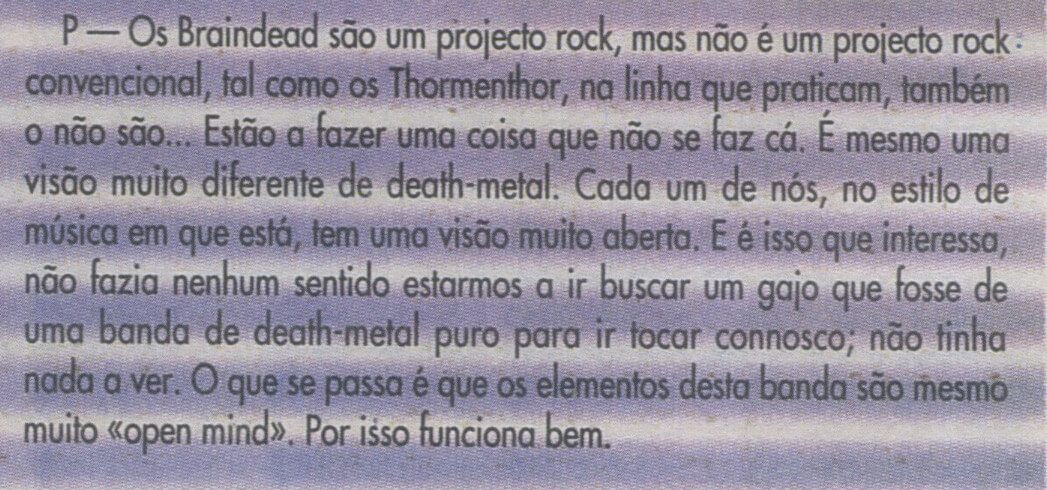 P – Os Braindead são um projecto rock, mas não é um projecto rock convencional, tal como os Thormenthor, na linha que praticam, também o não são… Estão a fazer uma coisa que não se faz cá. E mesmo uma visão muito diferente de death-metal. Cada um de nós, no estilo de música em que está, tem uma visão muito aberta. E é isso que interessa, não fazia nenhum sentido estarmos a ir buscar um gajo que fosse de uma banda de death-metal puro para ir tocar connosco: não tinha nada a ver. O que se passa é que os elementos desta banda são mesmo muito “open mind”. Por isso funciona bem.