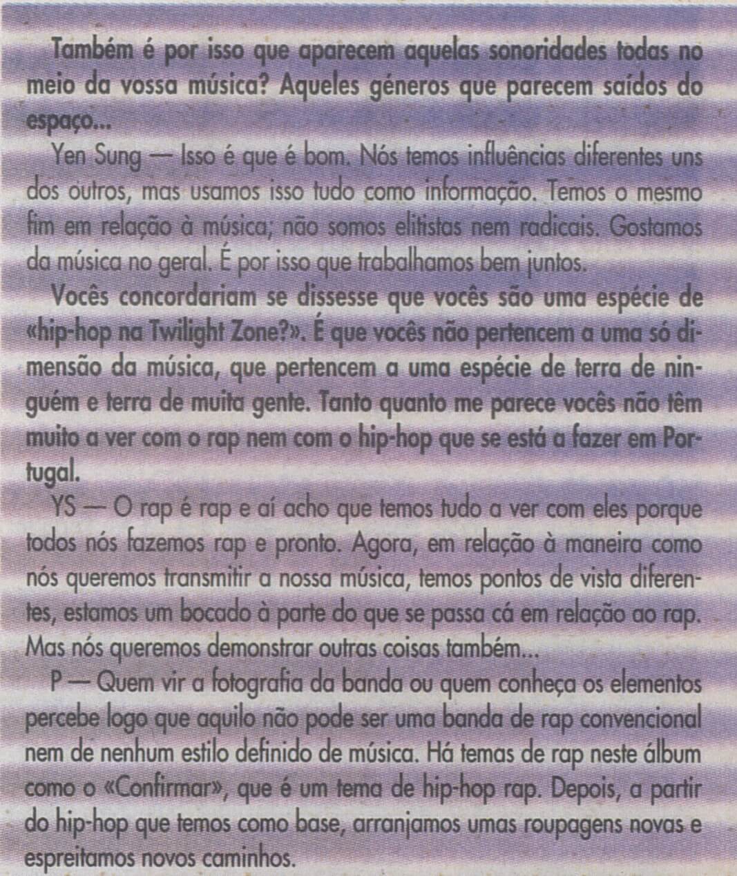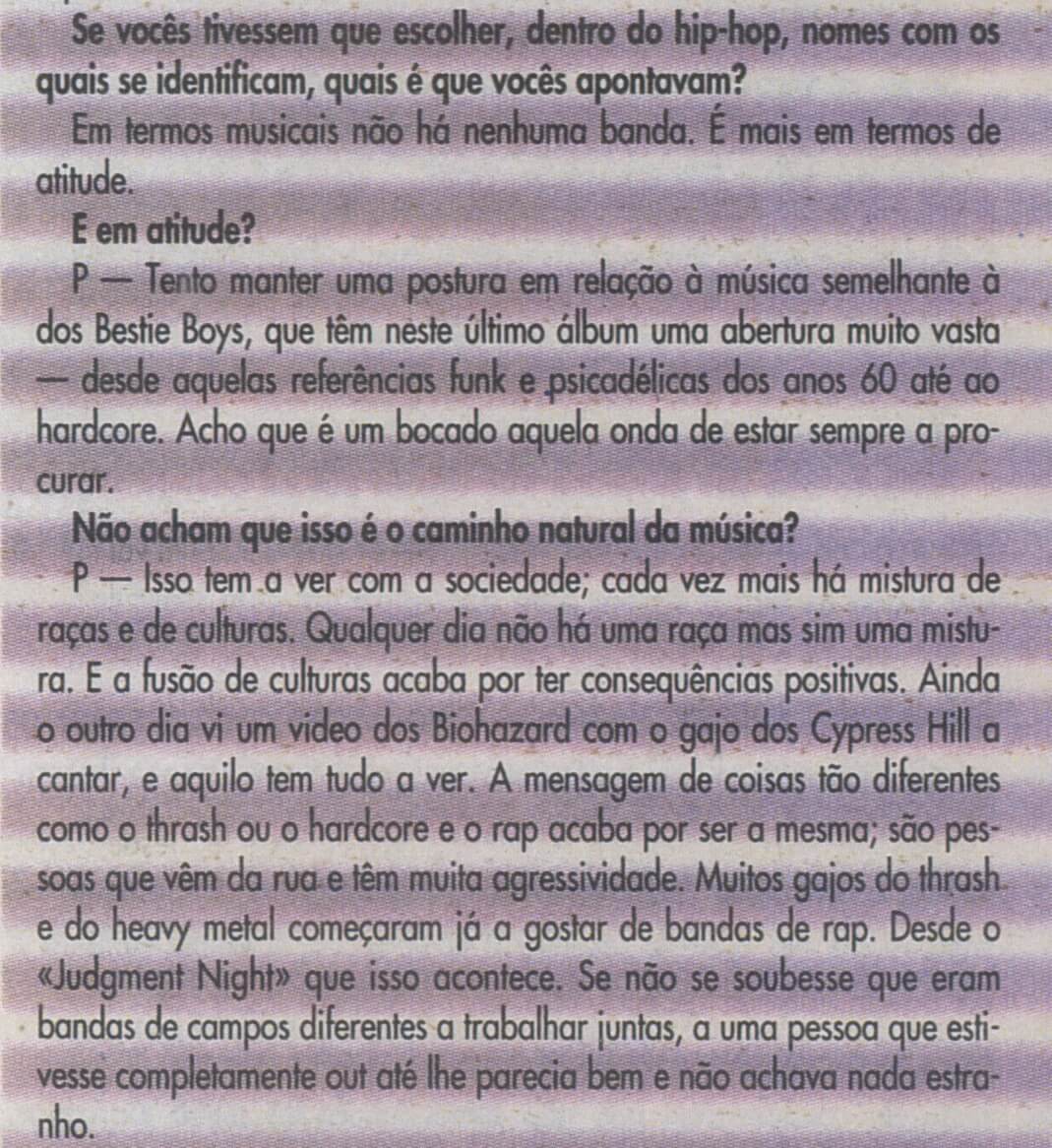 P – Isso tem a ver com a sociedade; cada vez mais há mistura de raças e de culturas. Qualquer dia não há uma raça mas sim uma mistura. E a fusão de culturas acaba por ter consequências positivas. Ainda o outro dia vi um video dos Biohazard com o gajo dos Cypress Hill a cantar, e aquilo tem tudo a ver. A mensagem de coisas tão diferentes como o thrash ou o hardcore e o rap acaba por ser a mesma; são pessoas que vêm da rua e têm muita agressividade. Muitos gajos do thrash e do heavy metal começaram já a gostar de bandas de rap. Desde o «Judgment Night» que isso acontece. Se não se soubesse que eram bandas de campos diferentes a trabalhar juntas, a uma pessoa que estivesse completamente out até lhe parecia bem e não achava nada estranho.