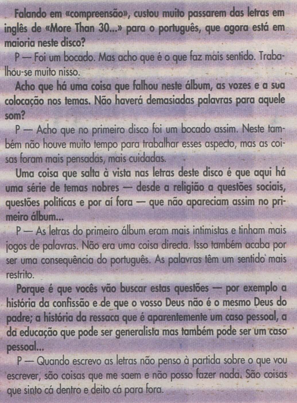 P — As letras do primeiro álbum eram mais intimistas e tinham mais jogos de palavras. Não era uma coisa directa. Isso também acaba por ser uma consequência do português. As palavras têm um sentido mais restrito.