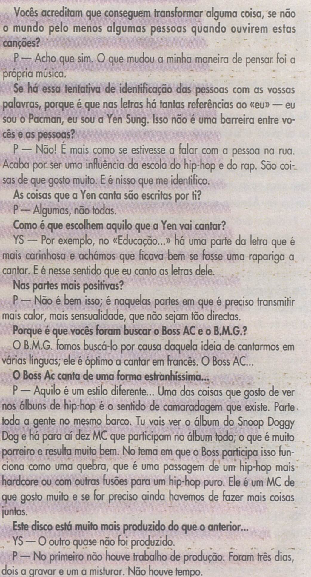 P — Aquilo é um estilo diferente… Uma das coisas que gosto de ver nos álbuns de hip-hop é o sentido de camaradagem que existe. Parte toda a gente no mesmo barco. Tu vais ver o álbum do Snoop Doggy Dog e há para aí dez MC que participam no álbum todo; o que é muito porreiro e resulta muito bem. No tema em que o Boss participa isso funciona como uma quebra, que é uma passagem de um hip-hop mais hardcore ou com outras fusões para um hip-hop puro. Ele é um MC de que gosto muito e se for preciso ainda havemos de fazer mais coisas juntos.