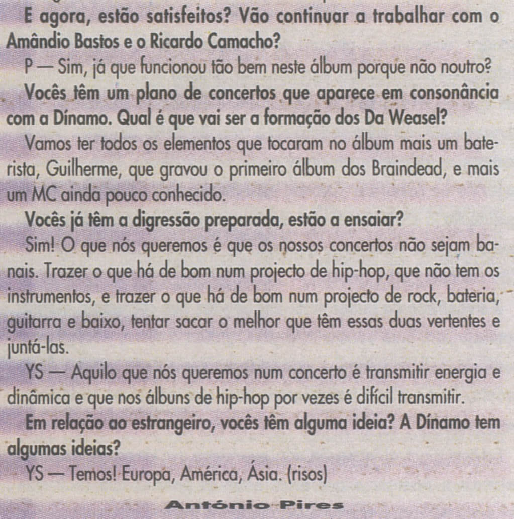 É importante para vocês que haja tanta gente diferente, desde Djs a músicos de variadas áreas nos Da Weasel? Apesar de, curiosamente, quase nenhum dos músicos estar limitado a uma linha musical. Por exemplo, o Armando já tocou em quatro grupos ao mesmo tempo: os lk Mux (que já acabaram), os Bizarra Locomotiva, os Da Weasel, os Boris Ex-Machina e mais alguma coisa que apareça. O Quaresma esteve nos Lesma e está nos Thormenthor. O João Nobre nos Da Weasel e nos Braindead…