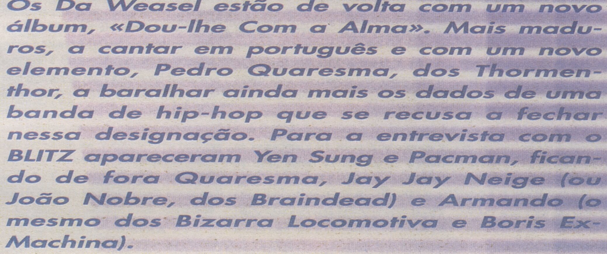 Os Da Weasel estão de volta com um novo álbum, “Dou-lhe Com a Alma”. Mais maduros, a cantar em português e com um novo elemento, Pedro Quaresma, dos Thormenthor, a baralhar ainda mais os dados de uma banda de hip-hop que se recusa a fechar nessa designação. Para a entrevista com o BLITZ apareceram Yen Sung e Pacman, ficando de fora Quaresma, Jay Jay Neige (ou João Nobre, dos Braindead) e Armando (o mesmo dos Bizarra Locomotiva e Boris Ex-Machina).