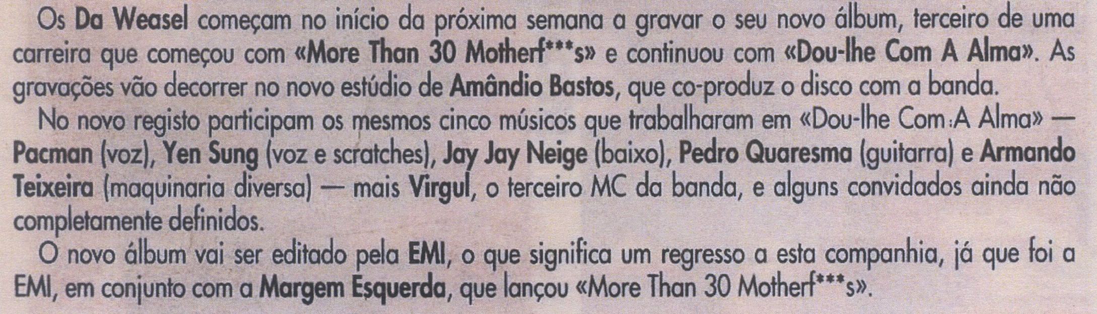 Os Da Weasel começam no início da próxima semana a gravar o seu novo álbum, terceiro de uma carreira que começou com «More Than 30 Motherf***s» e continuou com «Dou-lhe Com A Alma». As gravações vão decorrer no novo estúdio de Amândio Bastos, que co-produz o disco com a banda.
