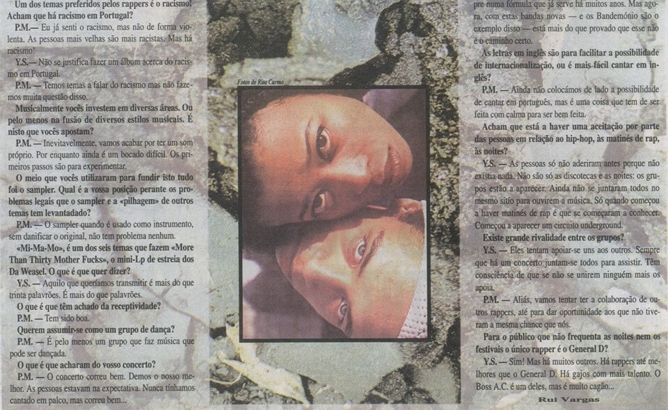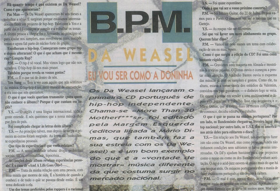 Y.S. — Em relação aos Da Weasel, nós queriamos fazer isto não como Da Weasel, mas como projecto. Ainda não tínhamos condições nem sabíamos se havia pessoas interessadas. Os DJ’s ajudam bastante para que projectos como o nosso ou como os dos Bandemónio tenham aceitação. O rap e o acid-jazz ouvem-se muito mais do que há uns tempos atrás. Os músicos portugueses têm a mania de fazer música em português e não fogem à cultura.