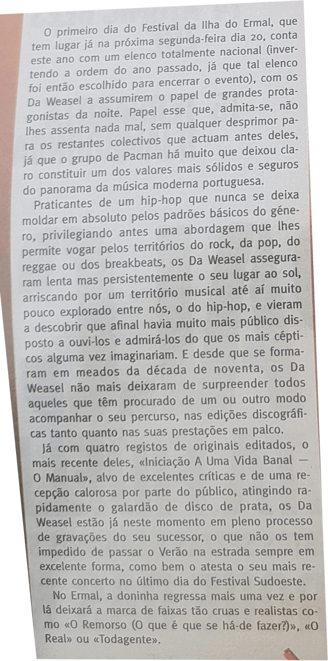 Já com quatro registos de originais editados, o mais recente deles, “Iniciação A Uma Vida Banal – O Manual”, alvo de excelentes críticas e de uma recepção calorosa por parte do público, atingindo rapidamente o galaradão de disco de prata, os Da Weasel estão já neste momento em pleno processo de gravações do seu sucessor, o que não os tem impedido de passar o Verão na estrada sempre em excelente forma, como bem o atesta o seu mais recente concerto no último dia do Festival Sudoeste.