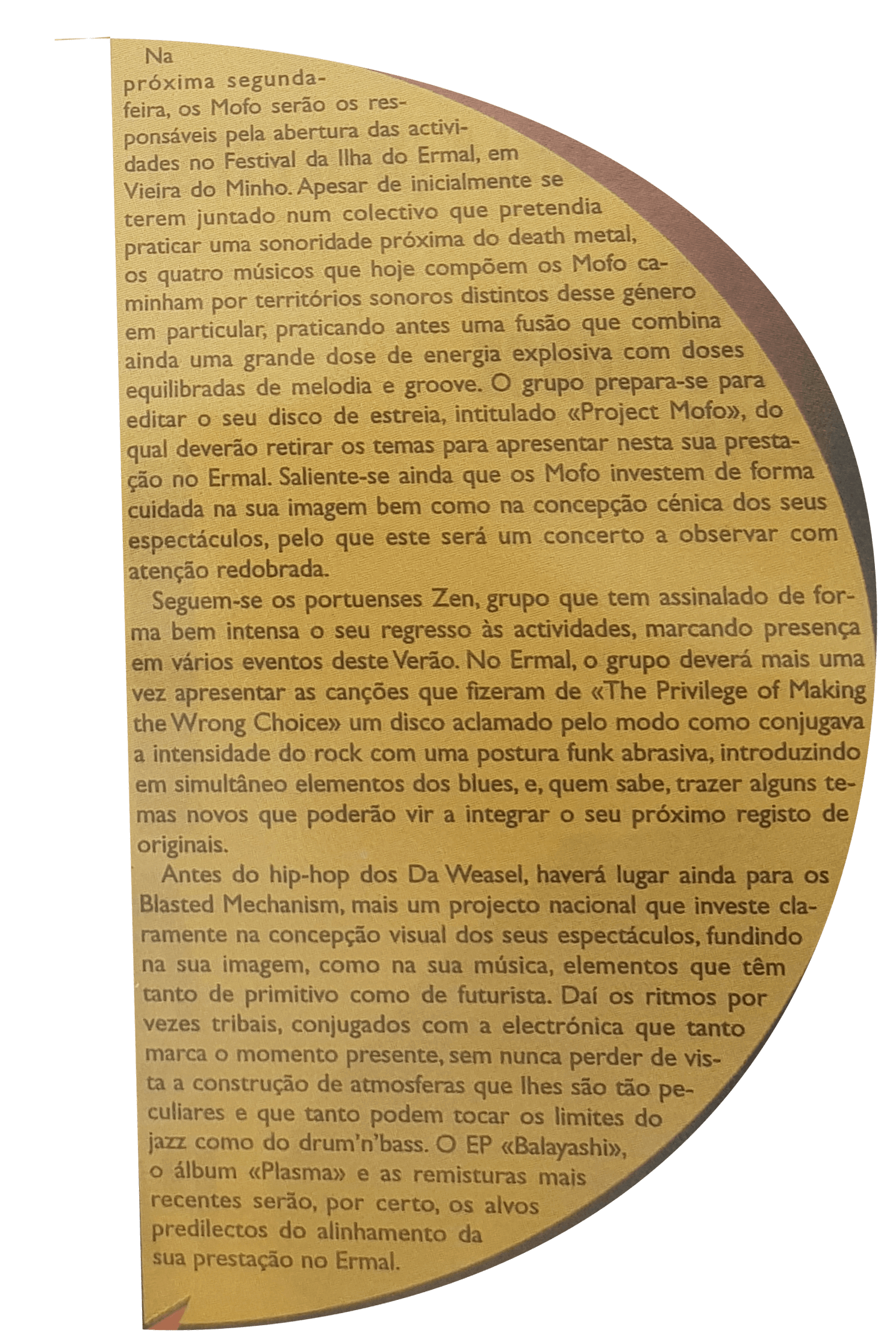 Na próxima segunda-feira, os Mofos serão os responsáveis pela abertura das actividades do Festival da Ilha do Ermal, em Vieira do Minho. Apesar de inicialmente se terem juntado num colectivo que pretendia praticar uma sonoridade próxima do death metal, os quatro músicos que hoje compõem os Mofo caminham por territórios sonoros distintos desse género em particular, praticando antes uma fusão que combina ainda uma grande dose de energia explosiva com doses equilibradas de melodia e groove. O grupo prepara-se para editar o seu disco de estreia, intitulado “Project Mofo”,do qual deverão retirar os temas para apresentar nesta sua prestação no Ermal. Saliente-se ainda que os Mofo investem de forma cuidada na sua imagem bem como na concepção cénica dos seus espectáculos, pelo que este será um concerto a observar com atenção redobrada.