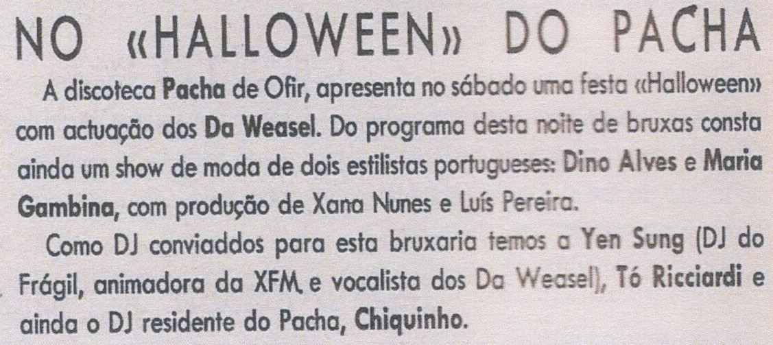 A discoteca Pacha de Ofir, apresenta no sábado uma festa «Halloween» com actuação dos Da Weasel. Do programa desta noite de bruxas consta ainda um show de moda de dois estilistas portugueses: Dino Alves e Maria Gambina, com produção de Xana Nunes e Luís Pereira.