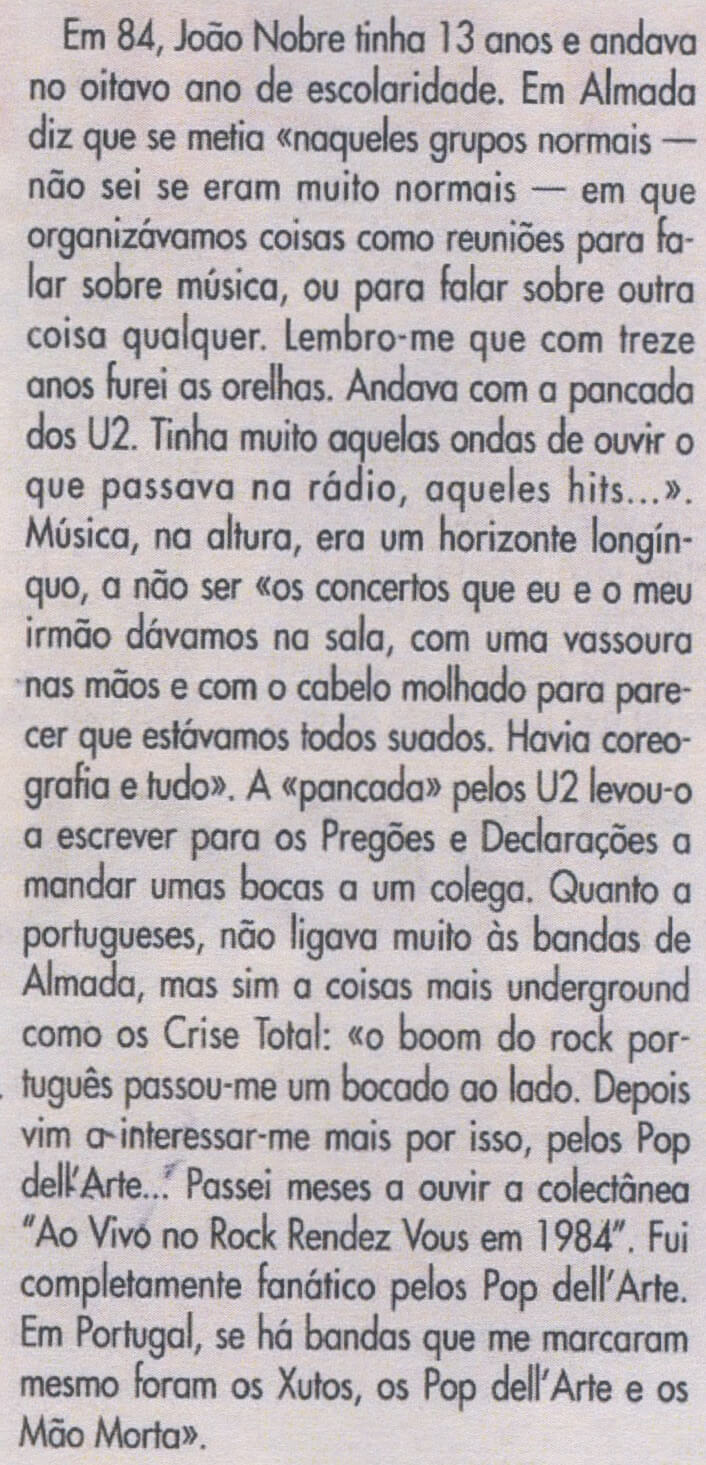 A «pancada» pelos U2 levou-o a escrever para os Pregões e Declarações a mandar umas bocas a um colega. Quanto a portugueses, não ligava muito às bandas de Almada, mas sim a coisas mais underground como os Crise Total: «o boom do rock português passou-me um bocado ao lado.