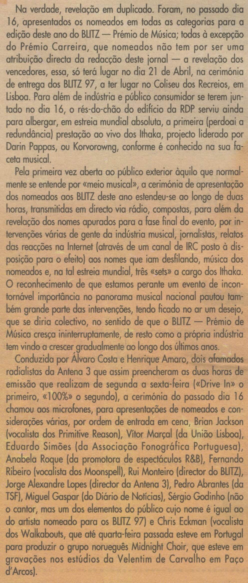 Na verdade, revelação em duplicado. Foram, no passado dia 16, apresentados os nomeados em todas as categorias para a edição deste ano do BLITZ — Prémio de Música; todas à excepção do Prémio Carreira, que nomeados não tem por ser uma atribuição directa da redacção deste jornal — a revelação dos vencedores, essa, só terá lugar no dia 21 de Abril, na cerimónia de entrega dos BLITZ 97, a ter lugar no Coliseu dos Recreios, em Lisboa.