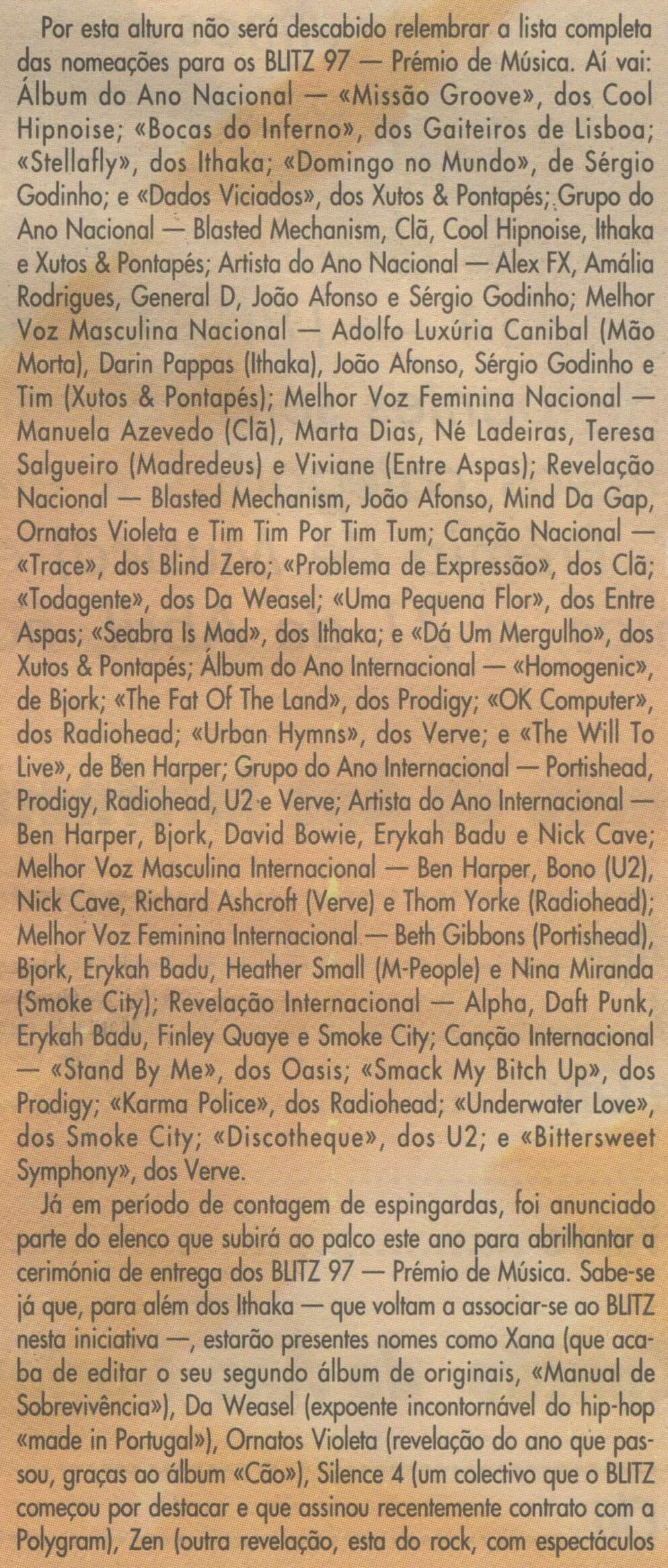 Por esta altura não será descabido relembrar a lista completa das nomeações para os BLITZ 97 — Prémio de Música.