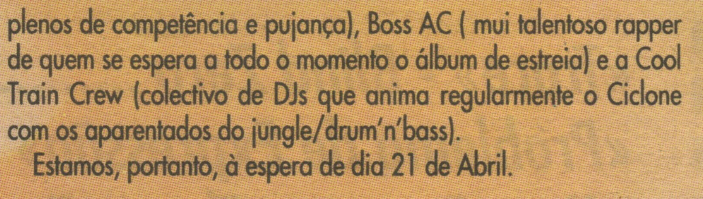 Sabe-se já que, para além dos Ithaka — que voltam a associar-se ao BLITZ nesta iniciativa —, estarão presentes nomes como Xana (que acaba de editar o seu segundo álbum de originais, «Manual de Sobrevivência»), Da Weasel (expoente incontornável do hip-hop «made in Portugal»), Ornatos Violeta (revelação do ano que pas-sou, graças ao álbum «Cão»), Silence 4 (um colectivo que o BLITZ começou por destacar e que assinou recentemente contrato com a Polygram), Zen (outra revelação, esta do rock, com espectáculos plenos de competência e pujança), Boss AC ( mui talentoso rapper de quem se espera a todo o momento o álbum de estreia) e a Cool Train Crew (colectivo de Ws que anima regularmente o Ciclone com os aparentados do jungle/drum’n’bass).