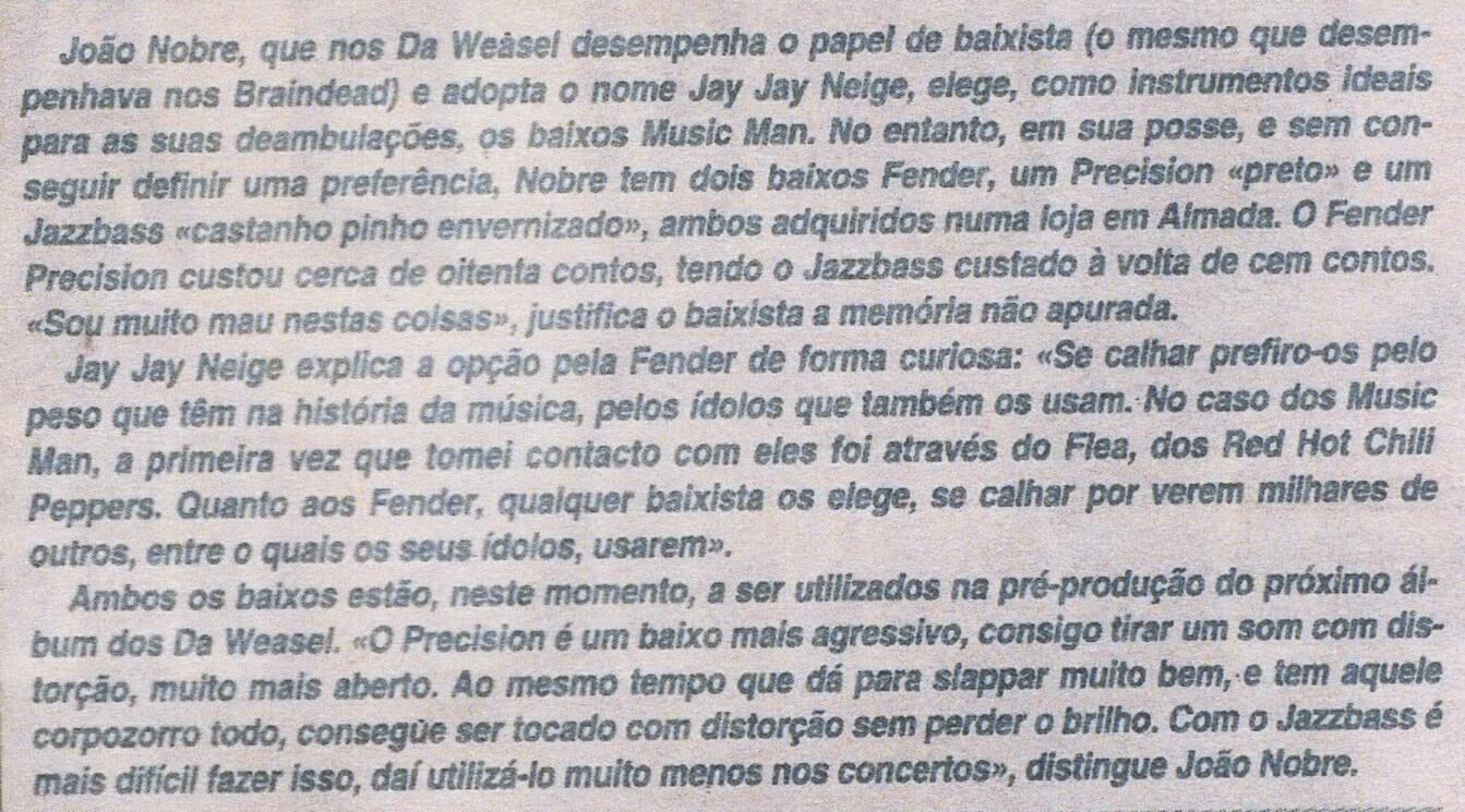 João Nobre, que nos Da Weasel desempenha o papel de baixista (o mesmo que desempenhava nos Braindead) e adopta o nome Jay Jay Neige, elege, como instrumentos ideais para as suas deambulações, os baixos Music Man. No entanto, em sua posse, e sem conseguir definir uma preferência. Nobre tem dois baixos Fender, um Precision «preto» e um Jazzbass «castanho pinho envernizado», ambos adquiridos numa loja em Almada.